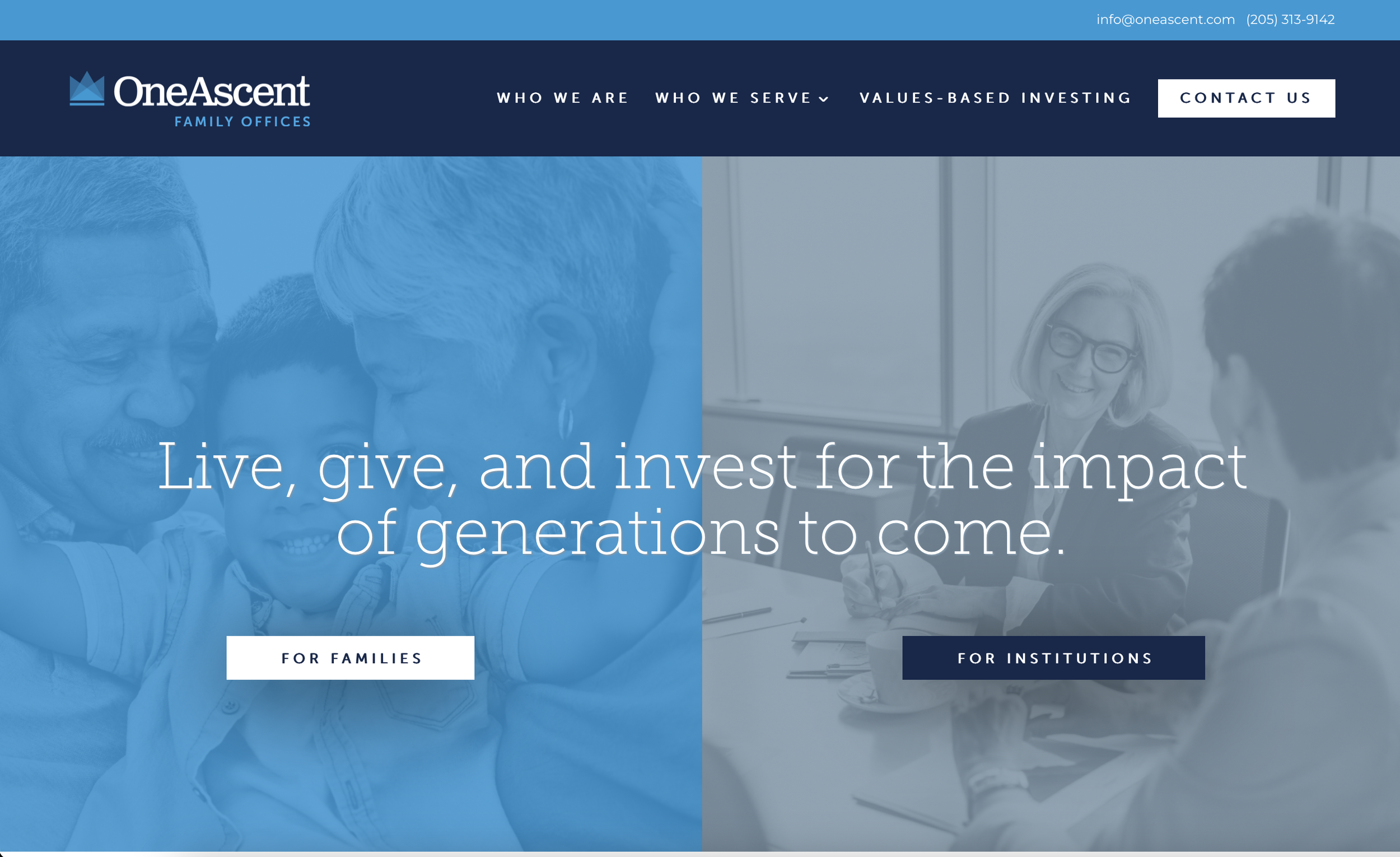 OneAscent leadership wanted a separate website for its new brand, OneAscent Family Offices. I worked with a web developer to create a new website theme that followed OneAscent brand guidelines, but also provided a more polished, refined aesthetic. I also worked with the leadership team to create all website copy, ensuring OneAscent Family Offices’ services were accurately portrayed in a tone that aligned with the site’s visual elements. I also built some of the pages, like this one.